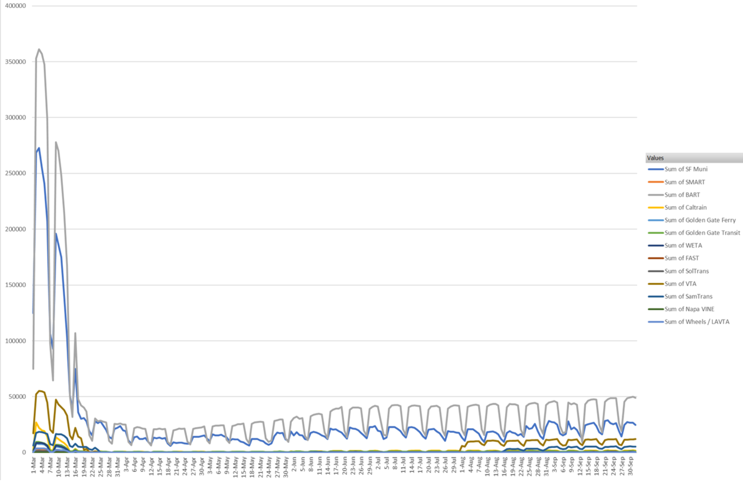 MTC’s Chart of Clipper Card use of Bay Area transit between 3.1.2020 and 9.30.2020