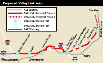 Any rational observer would take this to mean connecting BART to Livermore and ACE in a manner convenient to train riders and would-be train riders. But the TVSQVRRA, we later learned, had other plans. Instead of a viable connection between BART and ACE in Livermore, TVSQVRRA wants to build a 43-mile Valley Link line extending from BART’s East Dublin terminal to North Lathrop, over 30 winding track miles northeast of Livermore.