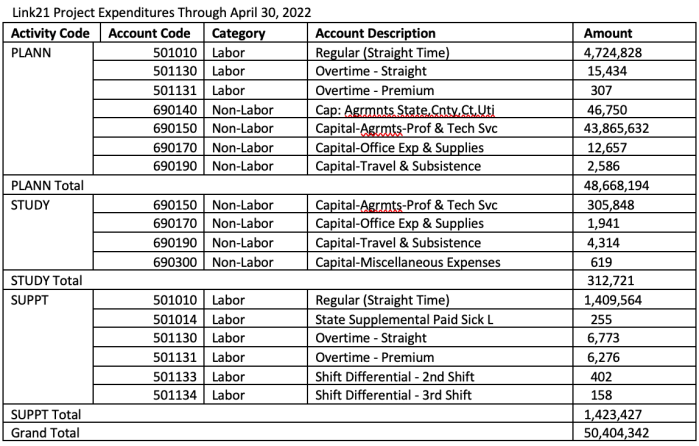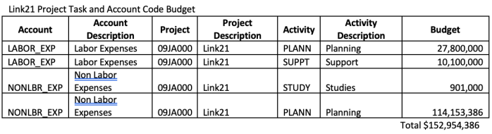 - Link21 Project task and subtask detail, including the chart of accounts established for managing expenditures and the budget associated with each account code.