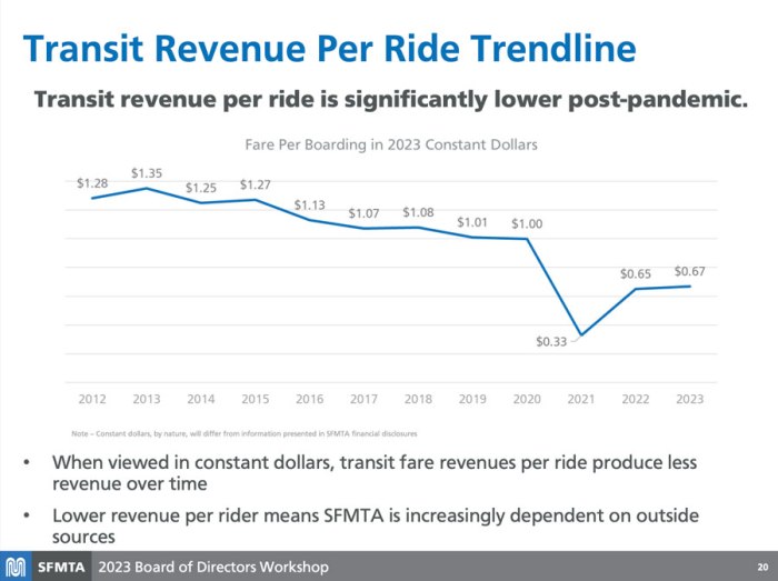- As shown in the MTA graph below the trend of the farebox revenue collected per ride is down. Part of this results from fare evasion. Fare evasion and bad behavior on transit vehicles both deny Muni needed funding and drive paying customers away. Getting rampant fare evasion under control will require both monitored cameras and a healthy police presence.
