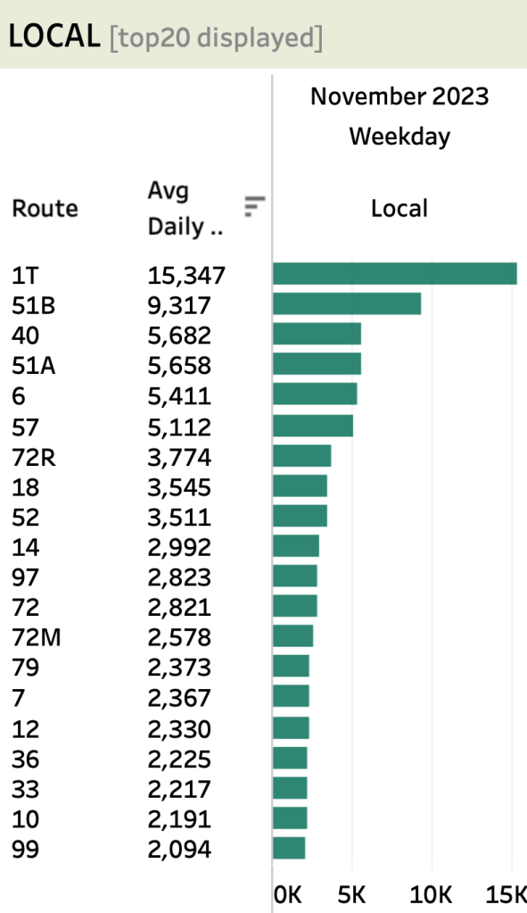 Table 1: Top 20 lines with highest daily ridership As indicated in the Table, Routes 1T, 51B, 40 and 51A are all carrying a respectable 5,000 riders a day or more. What is it about those five lines that makes them do so much better than the rest of the system? What sets them apart? Those engaged in planning the new route changes should take a very close look at these routes and determine what makes them standouts.